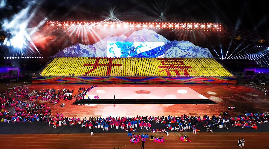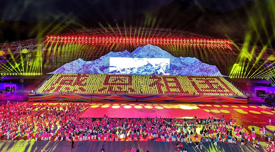 7月22日晚,拉萨市文化体育中心灯火通明、五彩缤纷,场内人声鼎沸、热闹非凡,伴随着本届运动会主题歌《让梦飞扬》,大型文体展演《奋进新时代》,运动会隆重拉开了序幕。